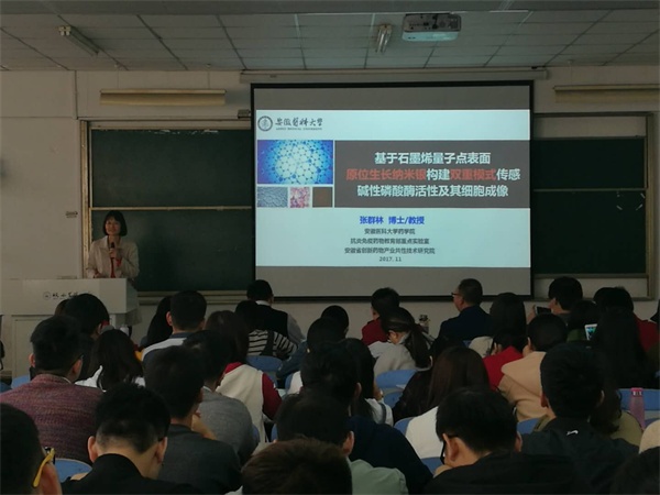 2017年11月1日下午,安徽医科大学教授、博士生导师张群林应BB贝博艾弗森官方网站邀请至BB贝博做了题为“基于石墨烯量子点表面原位生长纳米银构建双重模式传感碱性磷酸酶活性及其细胞成像”的学术报告,报告会由科技处副处长韩邦兴主持,制药工程专业同学及部分教师聆听了报告会。