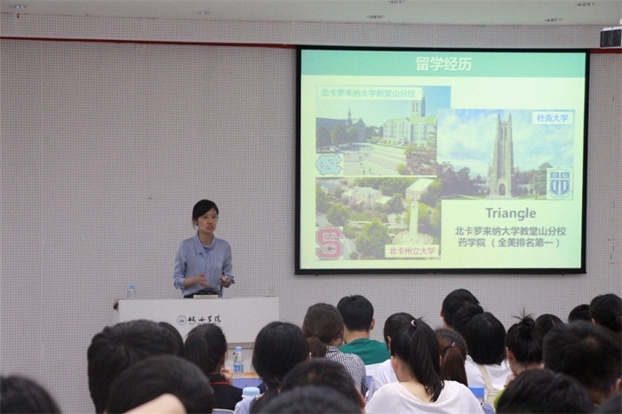 在题为“放飞医药健康的科学之梦”的报告中,何冰芳从自己上大学谈起,结合了自己的科研经历,介绍了天然产物挖掘、新型功能寡糖制备、肠道菌群与人体健康等热点问题,深入浅出分享了科研团队在天然药物开发、新型功能寡糖制备的最新成果。江苏省优青项目获得者姜天玥,从自己博士阶段的研究和国外的生活谈起,以纳米脂质体药物传送系统为研究对象,分享了自己一路走来的研究成果。报告会持续了2个多个小时,两位老师的幽默风趣,赢得掌声不断,也开阔了同学们的视野,强化了同学们努力学习、致力于科学研究的信心。