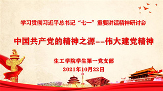 • 生工学院学生第一党支部召开感悟伟大建党精神学习研讨会 为深入学习贯彻习近平总书记“七一”重要讲话精神,进一步深化党史学习教育,10月22日晚,生工学院学生第一党支部采用线上形式召开了感悟伟大建党精神学习研讨会。研讨会上段文昌首先带领大家围绕“一个庄严宣告、一个主题、一个伟大精神、四个伟大成就、九个... 2021-10-24