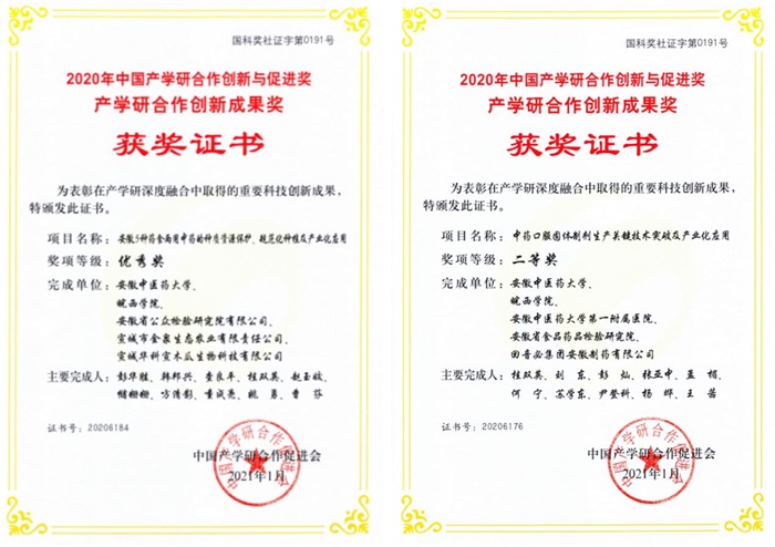日前,BB贝博收到了中国产学研合作促进会颁发的“2020年中国产学研合作创新与促进奖—产学研合作创新成果奖”获奖证书,BB贝博韩邦兴教授、刘东博士与安徽中医药大学、安徽省食品药品检验研究院、回音壁集团安徽制药公司等单位合作的“安徽5种药食两用中药的种质资源保护、规范化种植及产业化应用”项目以及“中药口服固体制剂生产关键技术突破及产业化应用”项目分别获得优秀奖、二等奖,该次产学研获奖是对BB贝博在产学研深度融合工作中取得重要成果的肯定。