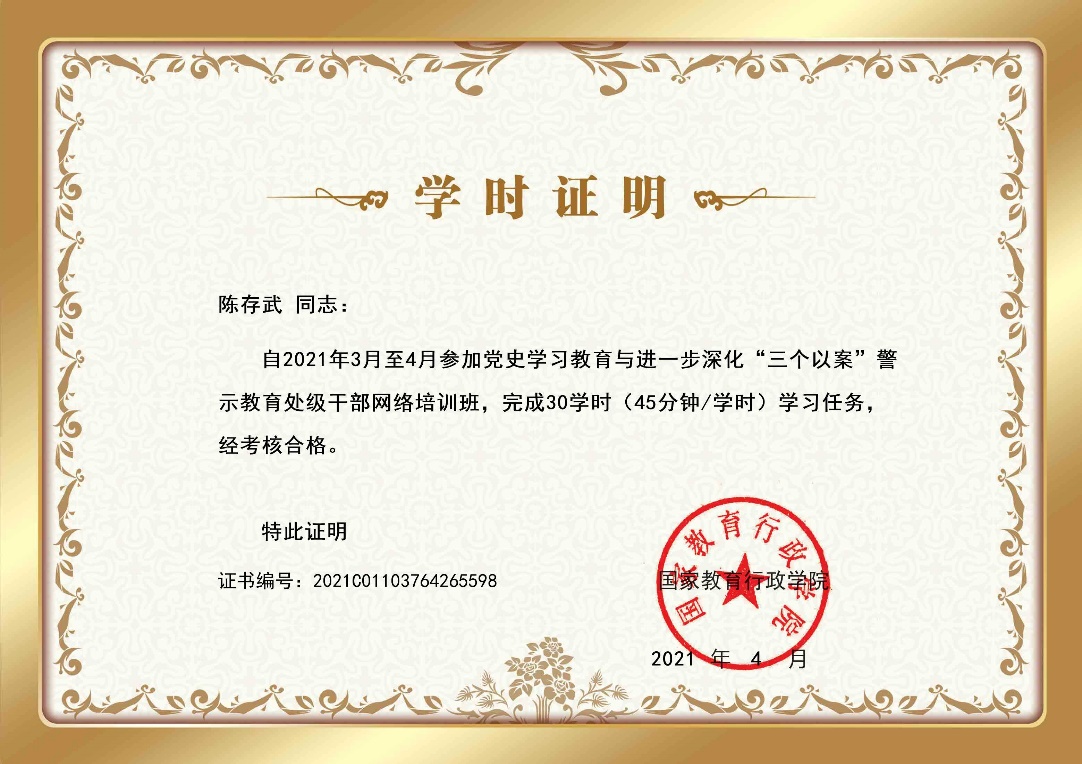 3、党史学习教育与进一步深化“三个以案”警示教育处级干部网络培训:陈存武。