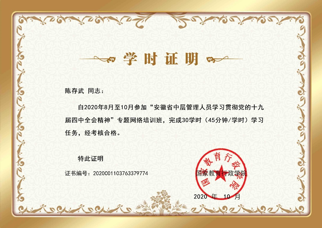 4、安徽省中层管理人员学习贯彻党的十九届四中全会精神专题网络培训:陈存武、李艳。