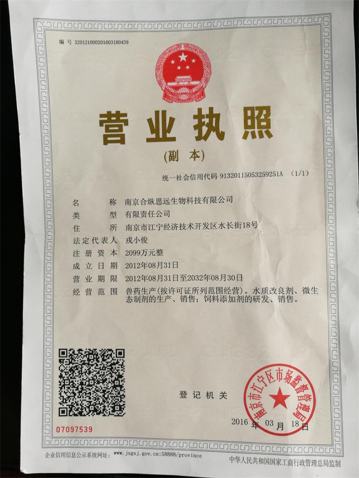 一、公司概况南京合纵思远生物科技有限公司成立于2010年,是一家高科技民营企业。公司应用现代生物技术,致力于兽药、饲料添加剂、水产养殖水体调控制剂等方面的研发、生产、销售和相关养殖技术服务。经过六年的发展,公司拥有南京、淮安两大GMP生产基地,正...