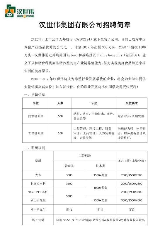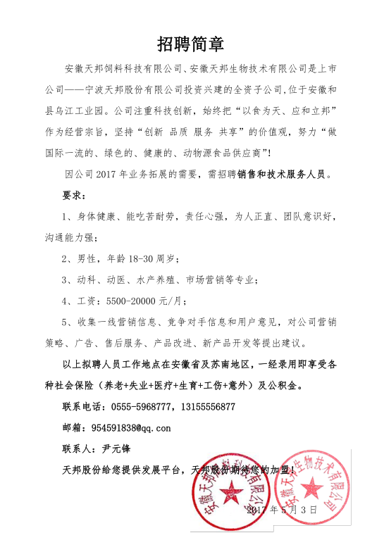 安徽天邦饲料科技有限公司、安徽天邦生物技术有限公司招聘简章