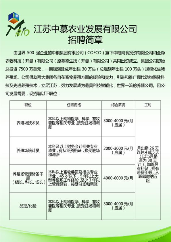 江苏中慕农业发展有限公司中粮慕德集团公司简介中粮慕德集团公司由三个公司组成,分别为江苏中慕农业发展有限公司座落于江苏省淮安市淮安区,江苏慕中农业发展有限公司座落于江苏省淮安市盱眙县,江苏慕康农业发展有限公司座落于江苏省南通市如东县。集团公司...
