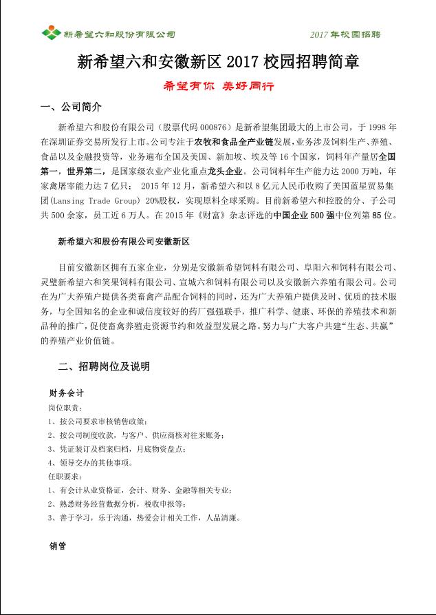 新希望六和安徽新区 2017校园招聘简章
