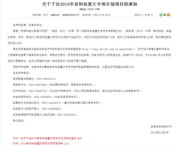 BB贝博喜获2019年度安徽省科技重大专项项目立项