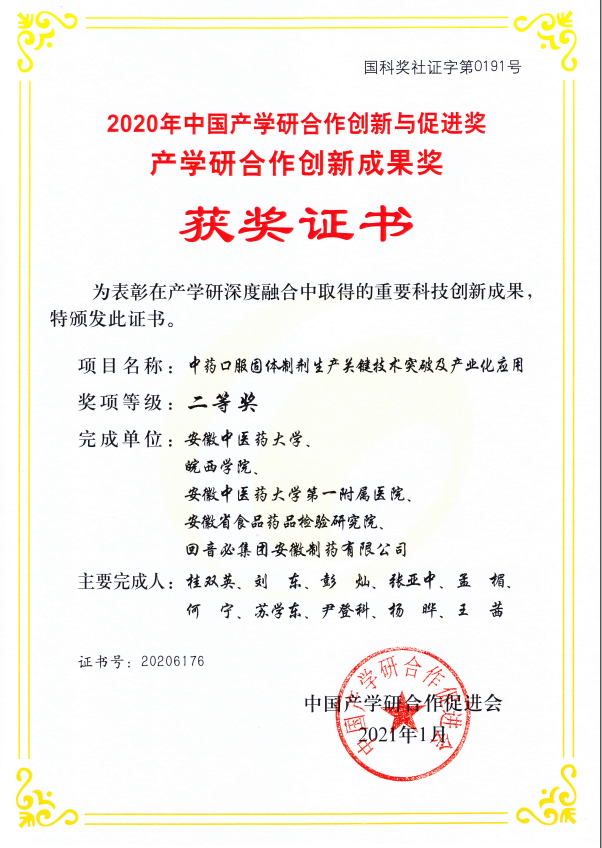 日前,BB贝博艾弗森官方网站收到了中国产学研合作促进会颁发的“2020年中国产学研合作创新与促进奖—产学研合作创新成果奖”获奖证书,BB贝博刘东博士与安徽中医药大学、安徽省食品药品检验研究院、回音壁集团安徽制药公司等单位合作的“中药口服固体制剂生产关键技术突破及产业化应用”项目荣获二等奖。这是我院取得的又一个省部级科技奖项,是对在产学研深度融合工作中取得重要成果的肯定。
